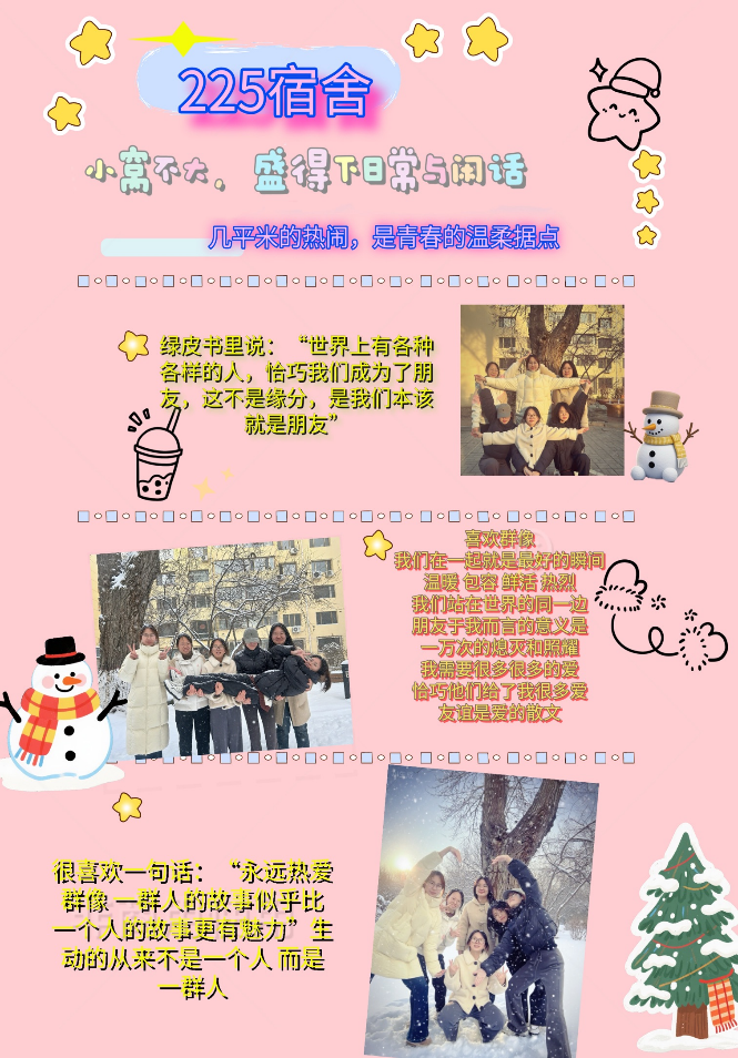 活动启动后,各宿舍积极响应、踊跃参与,充分发挥团队协作优势,巧妙融合数学学科的逻辑之美与艺术创作的灵动创意,用匠心定格校园暖冬的美好记忆。从主题构思的反复打磨、素材收集的细致筛选,到排版设计的精准布局、细节呈现的精益求精,每一个环节都凝聚着舍友们的共同心血与默契配合。