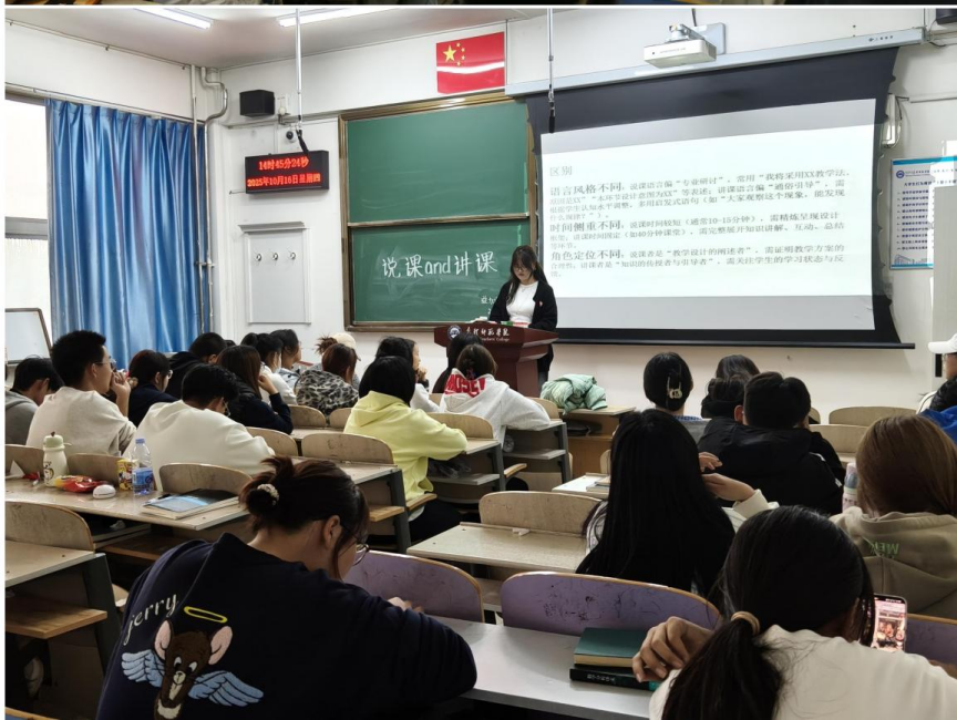 为深化师范生对教学核心技能的理解,精准提升课堂教学与竞赛说课的双重能力,我院益加翼教师技能协会于10月16日在博楼400教室成功举办“说课与讲课”专题培训活动。本次活动以“厘清差异·双能并进”为主题,通过专业讲解与案例对比,引导师范生明晰“讲课”与“说课”的本质区别,推动教学能力从“会教”向“会设计、会表达”的纵深发展。
