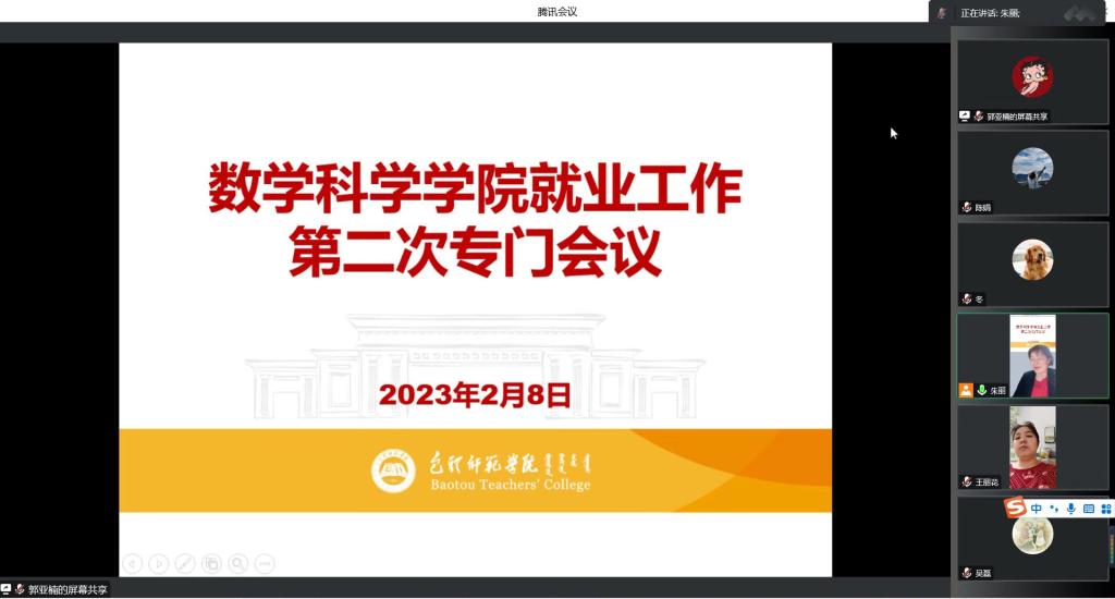 为严格落实学校寒假就业工作推进会的各项工作部署,扎实做好2023届毕业生就业工作,数学科学学院于2023年2月8日召开线上2023届毕业生就业工作推进会。数学科学学院党总支书记朱丽,副院长徐国明、实验室主任董金茂、系主任薛英、办公室主任王丽花、学工办负责人宋金锦、就业工作辅导员郭亚楠以及全体毕业班班主任等13人参加会议。