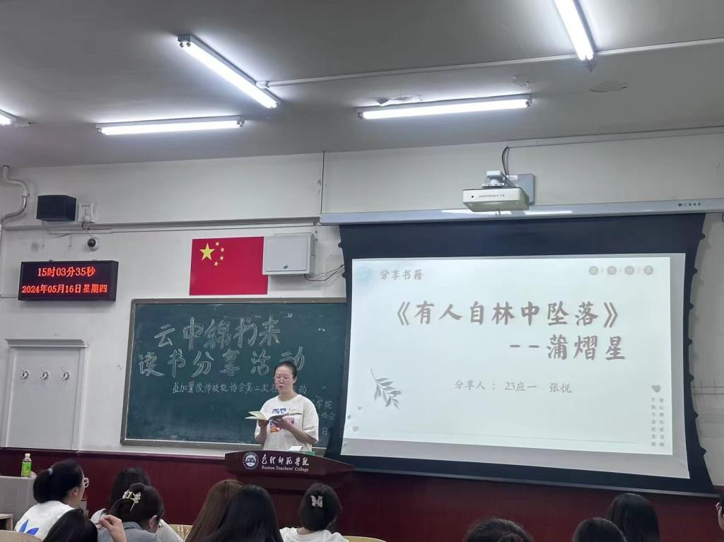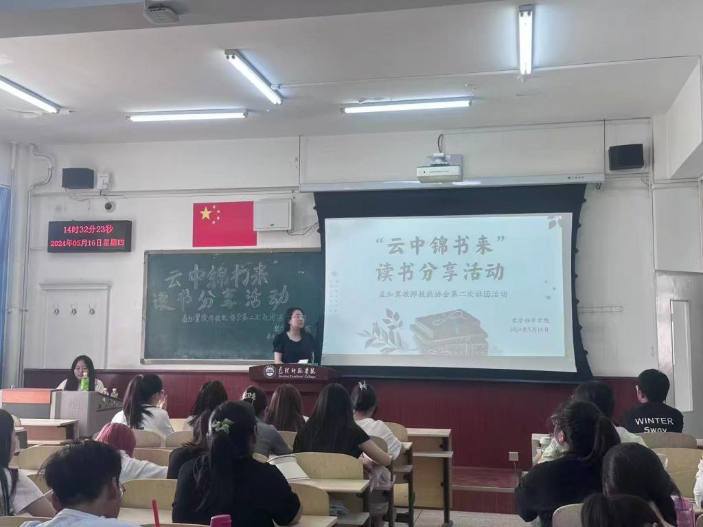 为引导师范生回归深度阅读,在书香中涵养教育情怀、拓展学科视野,我院益加翼教师技能协会于5月9日在博学楼东403教室成功举办“云中锦书来”读书分享活动。本次活动以“读数学·品人文”为主题,通过组内共读、集体观影、代表展示等环节,构建“读—思—享”一体化的学习场景,助力师范生在文字中触摸数学的温度与智慧。
