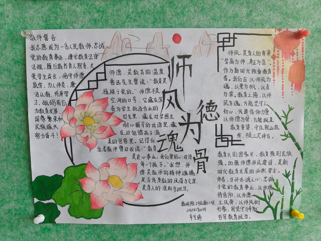 同学们积极参与、精心创作,将师德内涵、育人理念融入板报设计,作品主题鲜明、内容充实、形式多样,充分展现了师范生对教育事业的热爱与对师德师风的深刻理解。参赛作品经评选后,在恒德楼14楼集中展示,供全体同学观摩学习,形成了互学互鉴、共同提升的良好氛围。