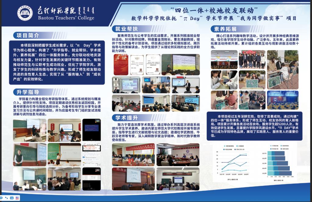 该项目2021年启动,以国际数学日为依托,构建“升学指导+就业帮扶+学术提升+素养拓展”四位一体服务体系,累计服务学生超5200人次。交流展示期间,我院学生会以现场答辩和展位展示的形式直观呈现出项目五年的实践成果——从考研复试辅导惠及1200余名学子,到教师招聘试讲指导助力120余名师范生就业,再到趣味数学活动吸引超2830人次参与,全面展现了项目精准化、全周期服务特色。