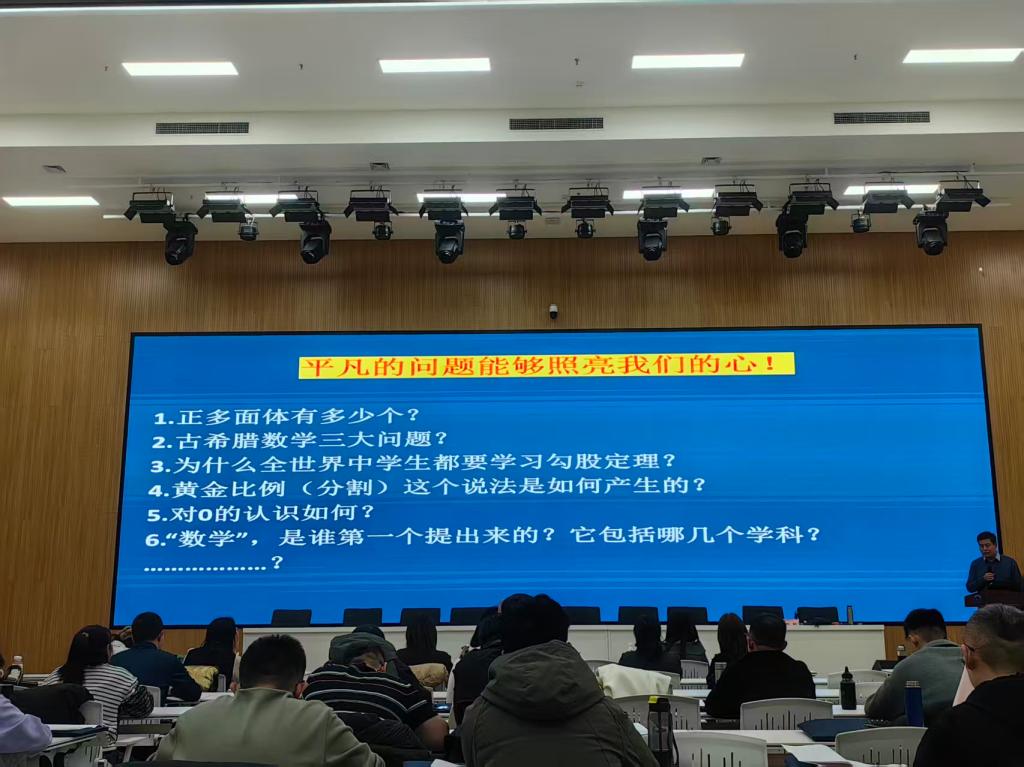 讲座中,代钦教授以“苏格拉底问题(正方形面积加倍问题)”“勾股定理的特殊情形”“黄金比例的起源”等经典数学问题为抓手,将抽象的数学思想转化为具象的教学案例。他指出,达・芬奇在研究正方形面积加倍问题时对无理数的探索,与当下初中数学教学中勾股定理、实数概念的讲解高度关联;黄金比例在达・芬奇艺术创作与数学研究中的融合应用,也为“双减”背景下设计跨学科、实践性数学作业提供了新思路。同时,代钦教授抛出“正多面体有多少个?”“‘数学’一词由谁首次提出?”等趣味问题,引发参训教师对数学本源的思考,强调“平凡的问题能照亮教学的本心”,提醒教师在运用人工智能工具辅助教学的过程中,切勿忽视对数学文化与学科本质的挖掘。